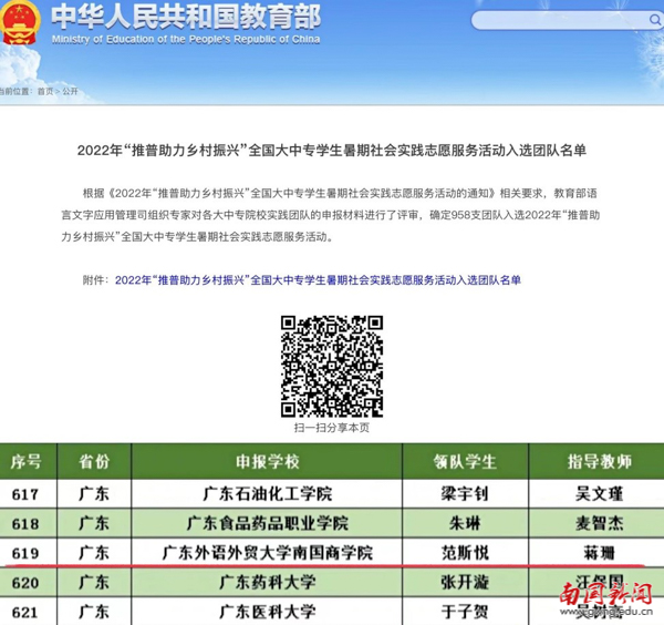 本网讯 近日,教育部发布《2022年“推普助力乡村振兴”全国大中专学生暑期社会实践志愿服务活动入选团队名单》,我校“星辰队”成功入选。广东省教育厅发布《2022年“推普助力乡村振兴”全国大中专学生暑期社会实践志愿服务活动广东省团队入选名单》,我校“星辰队”和“梦行队”成功入选。